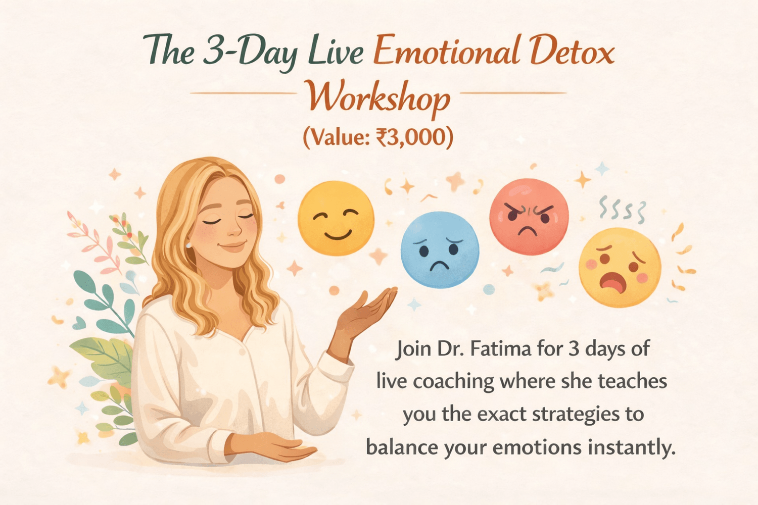 ✅ COMPONENT 1: The 3-Day Live Emotional Detox Workshop (Value: ₹3,000) Join Dr. Fatima for 3 days of live coaching where she teaches you the exact strategies to balance your emotions instantly.