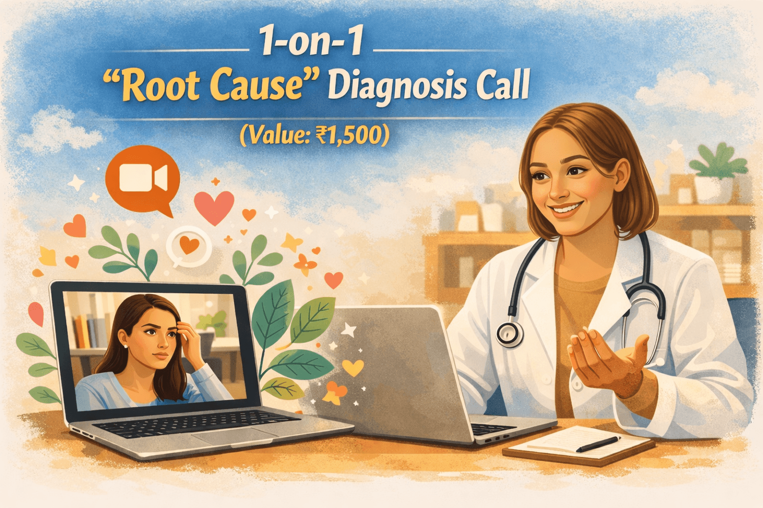✅ COMPONENT 2: 1-on-1 "Root Cause" Diagnosis Call (Value: ₹1,500) A private 15-minute video consultation where Dr. Fatima personally analyzes your symptoms to find the specific remedy you need.