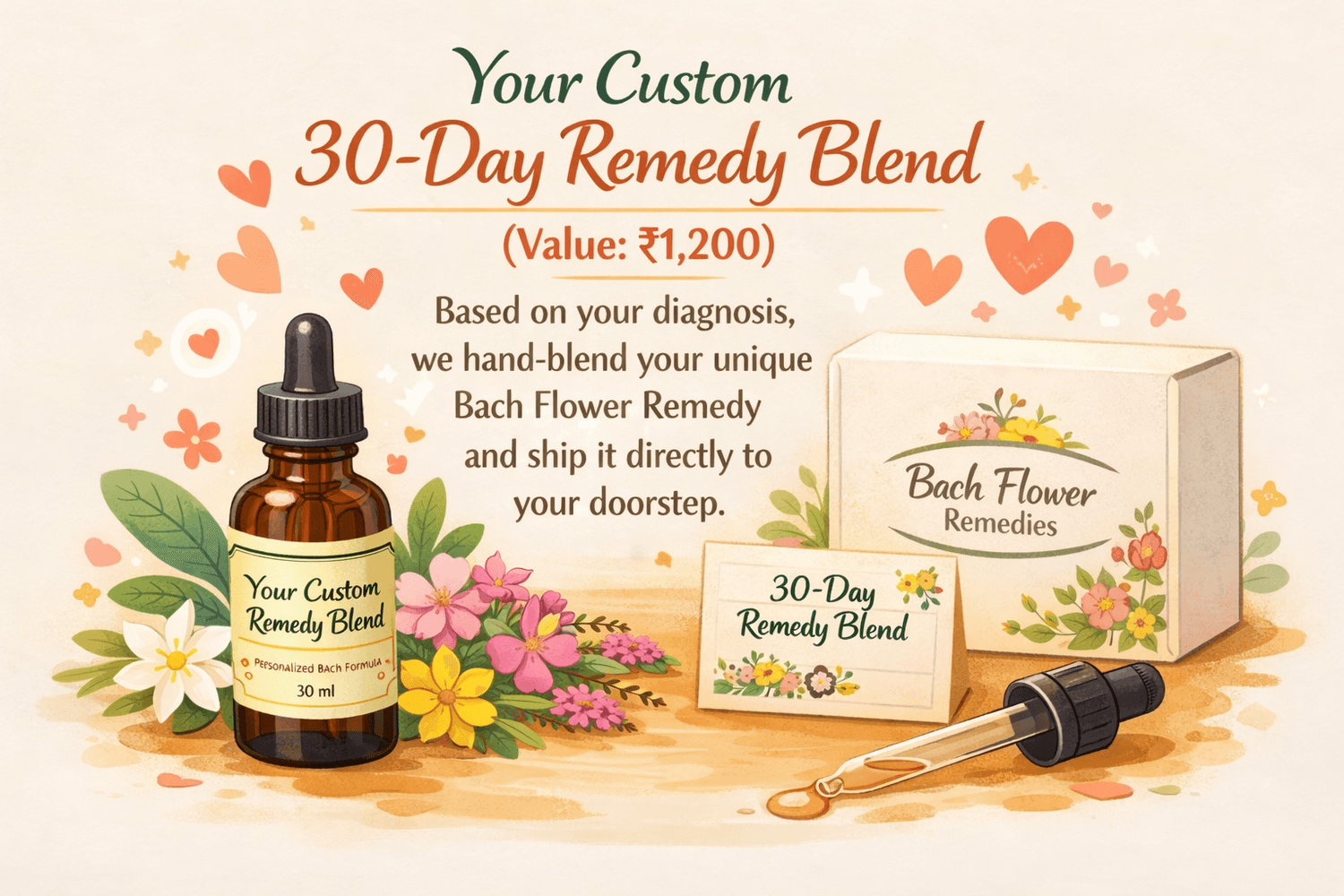 ✅ COMPONENT 3: Your Custom 30-Day Remedy Blend (Value: ₹1,200) Based on your diagnosis, we hand-blend your unique Bach Flower Remedy and ship it directly to your doorstep.