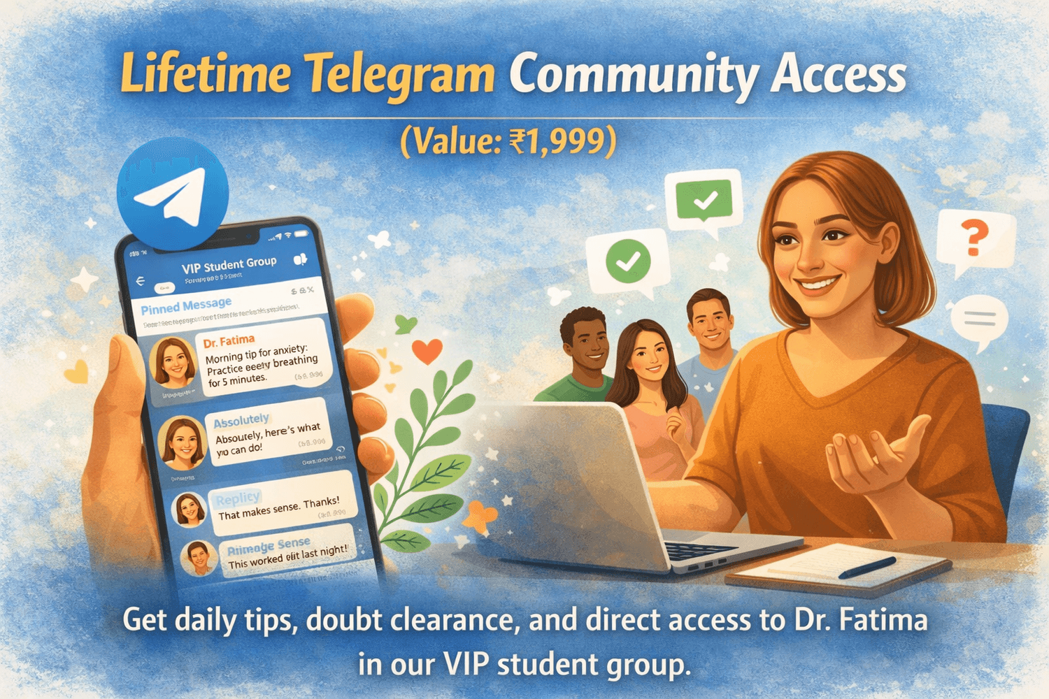 ✅ COMPONENT 6: Lifetime Telegram Community Access (Value: ₹1999) Get daily tips, doubt clearance, and direct access to Dr. Fatima in our VIP student group.