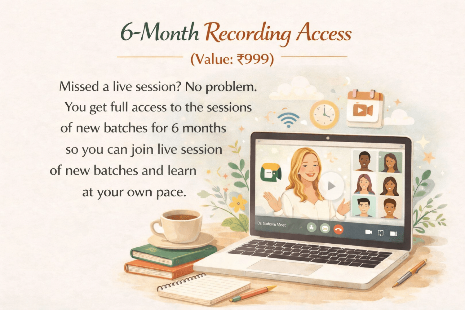 ✅ COMPONENT 5: 6-Month Recording Access (Value: ₹999) Missed a live session? No problem. You get full access to the workshops of new batches for 6 months so you can re-watch and learn at your own pace.