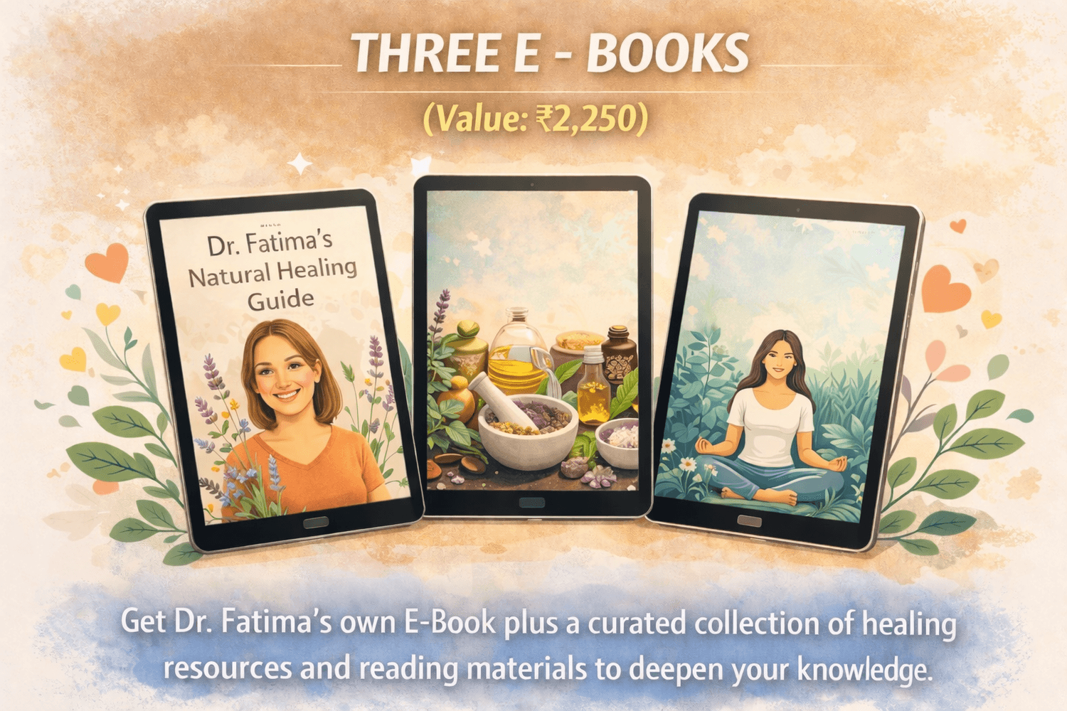 ✅ COMPONENT 7 : THREE E - BOOKS (Value: ₹2250) Get Dr. Fatima's own E-Book plus a curated collection of healing resources and reading materials to deepen your knowledge.